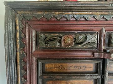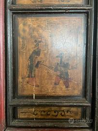 Mobile d’antiquariato orientale, decorato con scene pittoriche tradizionali su pannelli in legno. Le figure rappresentare personaggi in abiti antichi: funzionari, guerrieri o nobili; con temi popolari nei mobili d’epoca per richiamare saggezza, autorità, educazione e armonia familiare.