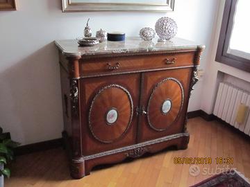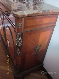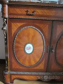 Servant (o credenza 2 porte) in bois de rose e palissandro, ceramiche di Limoges, piano in marmo Macchia Vecchia Svizzera e bronzi fusi. Stile Luigi XIV. Fabbricazione anni '60, della raffinata tradizione ebanista trevigliese Monzio Compagnoni. Valutazione 4/5000 euro minimo.