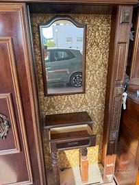 Vendo mobile d’ingresso in legno vintage con scomparto appendi abiti e altro scomparto con specchiera e alzata con cassettino. Sportello scorrevole. Larghezza 152 cm, altezza 181 cm, profondità 36 cm. Prezzo trattabile.