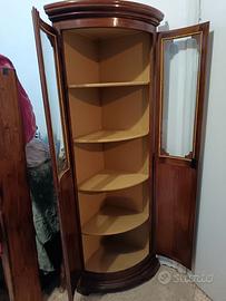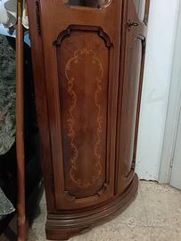 Angoliera stile antico in legno intarsiato con ante provviste di vetri curvi e mensole interne. Dimensioni contenute e gradevoli