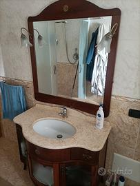 Mobile da bagno interamente in legno, colore noce chiaro, con piano in marmo di travertino colore giallo Egitto, specchiera con due applique perfettamente funzionanti, parte bassa con vetri opachi decorati, completo anche di fontana miscelatore in acciaio, l'equivalente nuovo costa circa 1400 euro