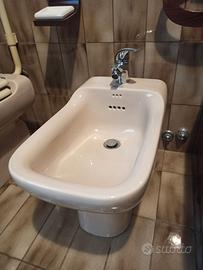 Mobile da bagno in legno completo di specchio illuminato e accessori vari (porta sapone, porta spazzolini, porta rotolo carta igienica, porta asciugamano per lavabo, bidet e doccia, porta scopino wc). Disponibili anche lavabo (70cm) a colonna, bidet e vaso WC a pavimento; tutto marca Ideal Standard