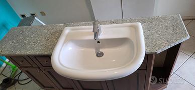 Vendo mobile da bagno in legno scuro con top in marmo , completo di lavabo in ceramica, ampia specchiera con faretti integrati e mensole in vetro laterali.