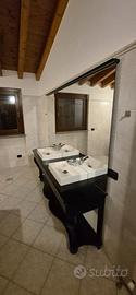 Mobile da bagno in legno, completo di specchio, 2 lavabi, 2 miscelatori e scarichi . In ottime condizioni. Dimensioni 2x2 metri
