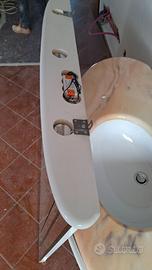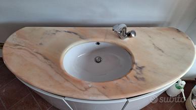 Mobile bagno completo di vasca in ceramica, piano di marmo rosa, miscelatore e sifone. Specchiera con luci.