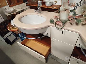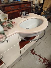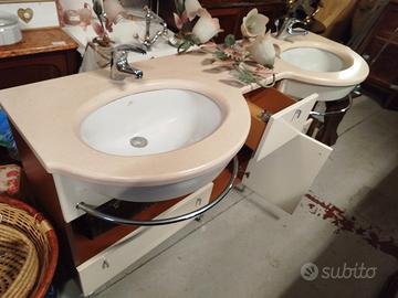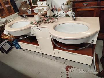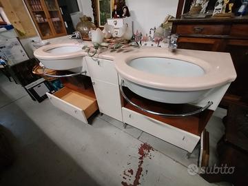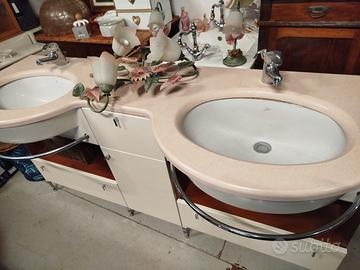 Mobile da bagno con base colori panna e ciliegio, top in marmo rosa cipria. Doppio lavandino Ideal Standard con miscelatori. Misure: (177 x 60 h. 85)