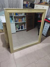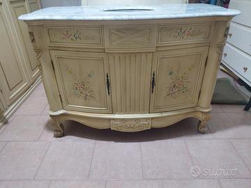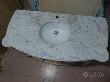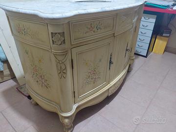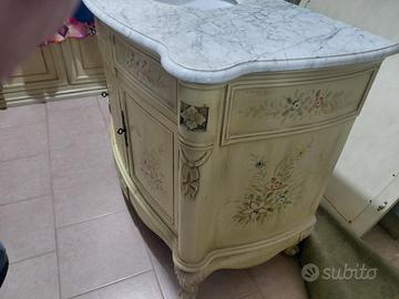 Vendesi mobile da bagno in legno stile veneziano. Top in marmo, lavello bianco in ceramica ad incasso. Due sportelli apribili anteriori. Misure cm 123 lungh. cm 61 profondità cm. 87 altezza. Specchio con cornice in stile veneziano 115 cm. x 112 cm.