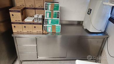 Solido e capiente mobile in acciaio inox, ideale per cucine professionali. Ottime condizioni. Dimensioni: Altezza 85 cm Lunghezza 200 cm Profondità 70 cm