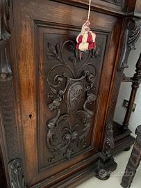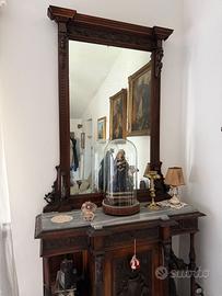 Mobile da ingresso tutto in legno intarsiato a mano, periodo 1850-1860, con specchiera lavorata a mano, buone condizioni generali