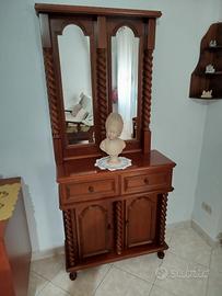 Mobile da ingresso con specchiera in stile classico con cornice decorata Dettagli: eleganti colonnine tornite sui lati, intarsiato sia lo specchio che il mobile composto da due cassetti e due antine perfetto per ambienti classici o per chi ama arredare con pezzi unici e senza tempo, struttura solida e legno di qualità in buono stato generale.