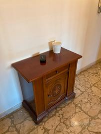 Mobile in legno color noce scuro . Intarsi delicati, in varie essenze sia sullo sportello inferiore che sul cassetto superiore. Dotato di 4 comode ruote per lo spostamento. Ottime condizioni generali.