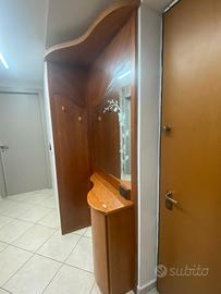 Parete d'ingresso angolare. Completo di specchio a parete, mensole, agganci appendi abiti e mobile apribile. Colore ciliegio.