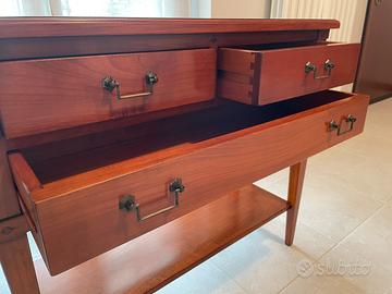 Mobile da ingresso classico in pregiato legno massello di ciliegio a cera. Incastro dei cassetti a coda di rondine. Pari al nuovo. Marca Giuseppe Visentin, specializzato nella produzione di mobili classici realizzati artigianalmente e a regola d’arte. Misure : larghezza cm 85, profondita’ cm 35. Designer: Charles Eastlake.