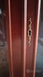 La parte superiore è costituita da due ante con pannelli in vetro, un elemento molto tipico di quel periodo. La ferramenta, come la bocchetta della serratura e la chiave sull'anta destra, è in ottone lavorato.