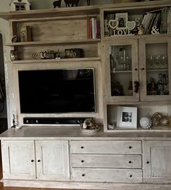 Mobile porta tv con mensole e vettina laterale a due ante, la parte inferiore è composta da un lato da due sportelli una cassettiera a tre cassetti centrale e uno sportello sull’altro lato Colore avorio invecchiato con velatura di martone chiaro Altezza 215 cm profondità 52 cm larghezza 220cm