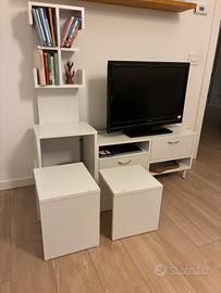 Mobile da salotto/camera comodo per tv e piccola libreria, dotato di due scomparti apribili con sistema push pull, un piccolo scomparto open comodo per pc o console e due piccoli mobiletti a incastro comodi come sedute o poggia bevande.