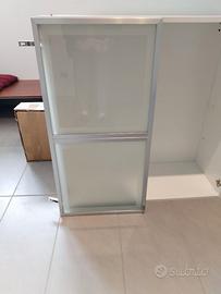 Mobile pensile ad anta doppia + anta singola di colore bianco, finiture grigio chiaro e top in legno color marrone.