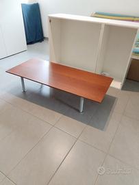 E' abbinato ad un tavolino porta televisore in legno, color ciliegio e piedi in metallo di colore grigio. Misura cm 60 di larghezza e cm 29x135 rispettivamente di altezza e lunghezza.