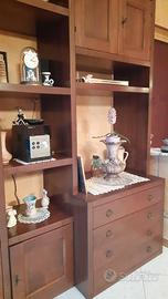 Condizioni ottime Suddiviso in: - parete L 220 X P 44 X H 250 (base porta TV L 84 X P 60) composta da vetrinetta a tre ripiani, 4 cassetti capienti, 5 vani con anta e 7 ripiani, - tavolo 220x50 (apribile a libro 220X100) - 4 sedie