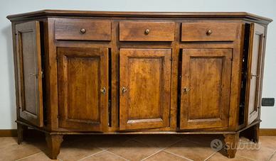Vendo, per cambio arredamento,madia in ottime condizioni stile " Arte Povera" molto capiente e di robusta artigianale costruzione.In legno massello color noce,le ante sono bugnate in stile antico e la lavorazione del mobile riflette un aspetto vissuto e consumato. Sostenuta da quattro piedi di aspetto singolare ,dispone di cinque ante e tre cassetti e la forma particolare la rende originale.