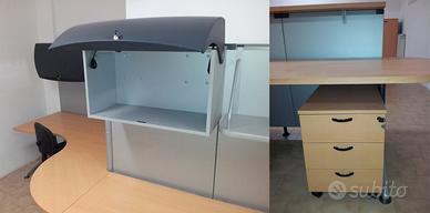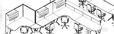 Vendo mobile da ufficio componibile in varie forme, con ampio piano di lavoro, elementi a muro e bancone front office. Le paratie possono essere montate o eliminate a piacimento. E' inclusa una cassettiera in tinta e 3 sedie.