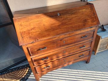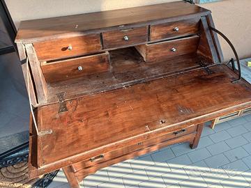 scrittoio con cassettini e 3 grandi cassetti, il mobile avrà piu o meno 80 anni quindi cigola quando si abbassa l'anta, in alto ha una macchia che ha tolto il colore deve essere stata una goccia di candeggina. Misure : 112h 112 L 55P