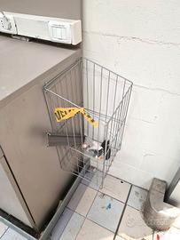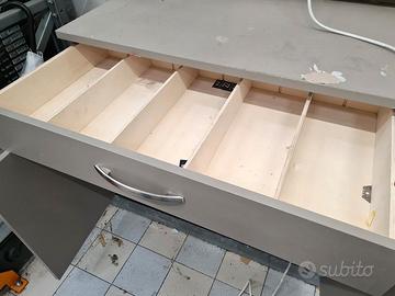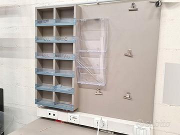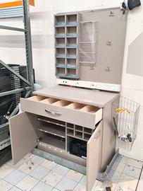 mobile di servizio per magazzini usato, si tratta di un mobiletto di servizio dotato di un cassetto, due ante a battente con ripiani interni, pinze per appendere i fogli, prese per la corrente, cestino porta materiali, paracolpi in acciaio zincato e parete porta oggetti per: chiavi, chiodi, penne, etc. dimensioni: 100X60cm h195cm