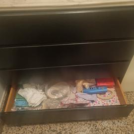mobile compopsto da specchio 60x80 più cassapanca h45 L80 lato destro e 4 cassetti e 2 ante con ripiani interni h 230 L 80 P 40 lato sinistro pannelli al muro h 270 totale larghezza 160 profondità 40