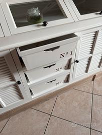 Vendo per amanti dello stile shabby chic questo bellissimo mobile credenza in perfetto stile Shabby chic con 3 ante vetrate e con 4 ripiani, pastiera a vista con 3 vetri, 3 cassetti estraibili e 2 ante per riporre oggetti.