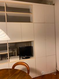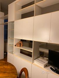 Mobile divisorio m 4,78 x h 2,71 a moduli composto da: 2 vetrinette e cassetti cm 48,5 arco passaggio m 106,0 2 moduli a giorno con ante sottostanti cm 92 cad 1 modulo ad ante cm 92 Una cerniera da sostituire