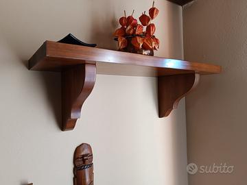 Mobile sala in legno con ante, scaffali, vetrinetta, cassetti piccoli e grandi e vano per TV e due mensole dello stesso stile. Dimensioni: lunghezza 285 cm, altezza 218 cm, profondità mobile 35 cm, profondità vano TV 60cm. Dimensioni mensole 87,5 x30 cm.