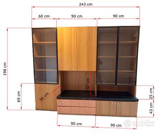 MISURE MOBILE: ALTO 198 cm LARGO 243 cm, PROFONDO 45 cm NELLE ANTE e 56 cm NEL RIPIANO NERO.