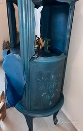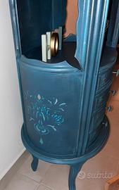 Mobile a quattro cassetti, particolare nella forma , molto elegante interno cassetti foderati con carta da parati. Pomelli originali trattati e dipinti. Parte laterali del mobile ho giocato con dei stencil per dare un tocco di colore …. Il mobile rifinito anche con della cera oro e del protettivo .