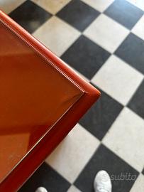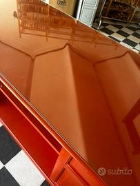 Mobile espositore per negozio. In legno arancione. Piano in vetro, con una piccola crepa in un angolo, come da foto. 175 x 89 cm, altezza 90 cm. Ritiro in loco.