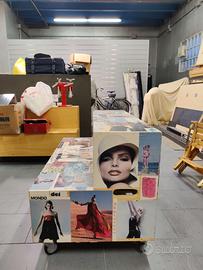 mobile espositore in legno multistrato con ruote piroettanti ricoperto di carta. Misure 125 x 60 x 55 di altezza più ruote