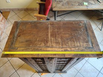 Mobile etnico in legno massello con ante/shutters indiani di recupero, ferramenta in ferro e ripiani interni.