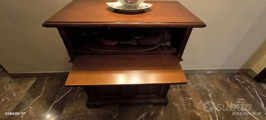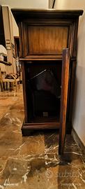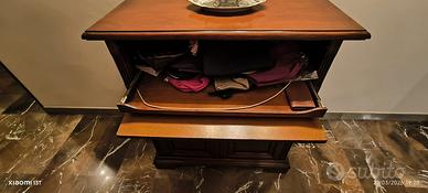 Raffinato mobile in legno per impianto HI-FI con piano superiore a ribalta per giradischi. Dotato di vani laterali specifici per dischi in vinile e sportelli inferiori per amplificatore o casse. Pezzo d'arredo solido e di grande fascino retro, condizioni eccellenti.