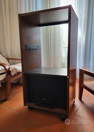 Mobile porta impinato hi fi, laminato color legno scuro, anta di vetro fumé con chiave, anno 1978. Zona riponi dischi in basso. Quattro rotelle.