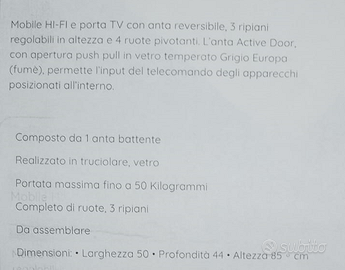 NUOVO - ANCORA IMBALLATO per mancato utilizzo Mobile HI FI e porta TV con anta reversibile, 3 ripiani regolabili in altezza e 4 ruote pivotanti. Da assemblare. Larghezza 50 cm, profondità 44 cm, altezza 85 cm. Mai Usato, ancora con imballaggio originale.