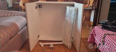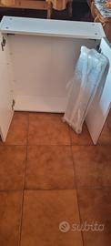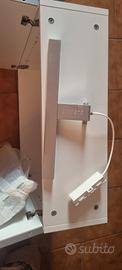 Mobiletto per il bagno, con 2 ante a specchio. All'interno 2 ripiani in vetro e compreso anche di luce da mettere al di sopra. Il mobiletto misuta 60×64×21. Unica problema è la crepa sullo specchio se può essere cambiata senza problemi, nuovo non ha usure, in perfetto stato.