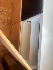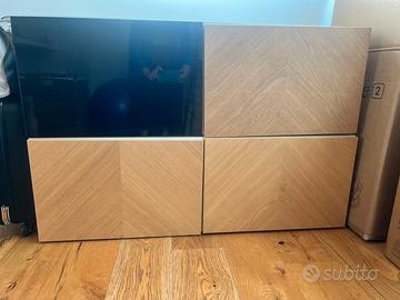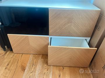 Mobile ikea aquistati nel 2024. La parte superiore è divisa sa quella inferiore e ha due ante con allinterno una mensola per ciascuna. La parte inferiore ha un’anta e un cassetto come si vede in foto. Possono essere messi uno accanto all’altro come mobile tv o sovrapposti. Vendo per cambio arredamento.