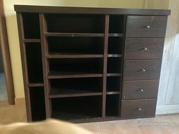 Mobile artigianale in rovere wengé per impianto stereo fatto a mano con ripiani removibili e 5 cassetti, usato in ottime condizioni, piccole imperfezioni dovute all'usura