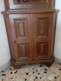 Mobile ad angolo in legno, parte superiore con vetrina e mensole, parte inferiore con sportello lavorato e mensole, ben conservato. No spedizione ritiro solo in loco, facilmente trasportabile in quanto le due parti sono divisibili.
