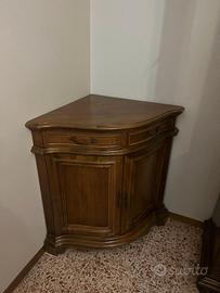 Vendesi elegante mobile ad angolo (angoliera bassa) in legno, ideale per ottimizzare lo spazio in salotto o ingresso. Il mobile si distingue per la particolare apertura dei cassetti superiori "a ventaglio" e per l'ampio vano inferiore a due ante con ripiano interno.