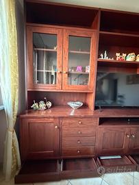 Vendo mobile in legno massello per rinnovo appartamento. Fatto artigianalmente da un falegname, con due vetrinette, spazioso, con cassetti a scomparsa sulla base. Mensole profonde 32 cm, cassetti e ante profondi 53 cm. Molto capiente. Misure totali 364x60,5x260.