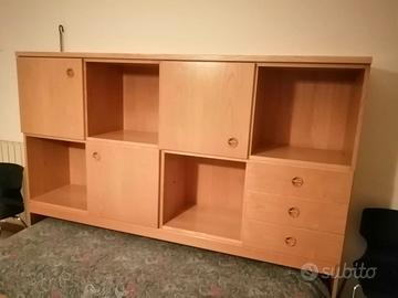 Mobile in legno in parte a giorno in parte con cassetti e sportelli con letto singolo e letto estraibile che possono essere uniti e fare un letto matrimoniale, completi di materasso. Misure: Altezza cm. 159 - Lunghezza cm. 206 - Profondità cm. 46.