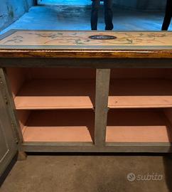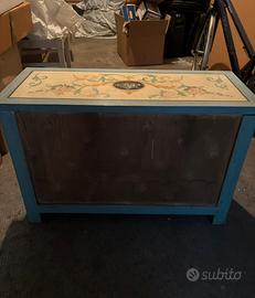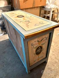 Vendo bellissima cassapanca in legno laccato, dorato e dipinto in stile tirolese colore azzurro e giallo con disegni floreali. Tenuta molto bene. Datato probabilmente intorno agli anni 60. Acquistato da un antiquario di Modena negli anni 90.