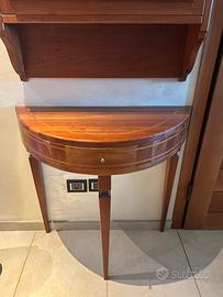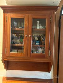 Vendo mobile in legno massello con intarsi, sopra hanuna vetrinetta con scaffalature e lanparte sotto ha una cassettiera per posizionare gli oggetti o i documenti.