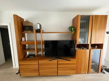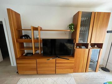 Mobile soggiorno di vero Design con vetrine e cassettiera, in legno massello di noce nazionale. Ottime condizioni generali, non presenta rigature o botte, tenuto in modo maniacale. La struttura è estremamente solida essendo di legno massello ed è composta: - da un mobile sottostante diviso in 3 sezioni (2 ante con un ripiano in vetro all'interno e una cassettiera a 4 cassetti al centro), - da 2 mobili a colonna con ventrina (presentano 2 riapiani in vetro ciascuno all'interno, ideali per riporre bicchieri e bottiglie) - 2 mensole a tutta lunghezza dello spessore di 4cm (possibilità di montare una luce led sottostante) - 1 mensola più corta sorretta dal montante centrale lunga 105 cm (permette di mettere una TV al centro da 40 pollici (oppure da 50 come nella foto spostandola un po più avanti). Lunghezza mobile: 333cm Altezza mobile: 235cm Profondità mobile sottostante: 53cm Profondità mobile vetrine: 42cm Per ulteriori foto o informazioni non esitate a contattarmi. Il mobile al momento è ancora montato, per facilitare il rimontaggio a casa all'acquirente da parte dei trasportatori che verranno a smontarlo (possibilita di farlo trovare anche già smontato). Spedizione non consigliata viste le dimensioni e trasporto a carico dell'acquirente.