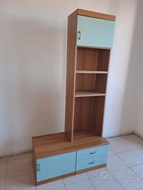 Vendo mobile in legno color ciliegio e dettagli verde pastello, composto da: -colonna con ripiani aperti e vano superiore con anta -base con vano contenitore e due cassetti Ottimo per soggiorno, studio o cameretta. Dimensioni mobile alto: altezza 164, larghezza 60 cm, profondità 30 cm Dimensioni base: altezza 40 cm, larghezza 200, profondità 47 cm